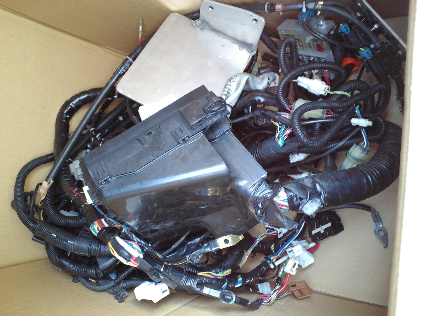 エンジンハーネスを取り外しました。 元々の車がMOTECとラリーアートECUのダブルで使っていたんですね。 このエンジンハーネスは返却することになりました。
